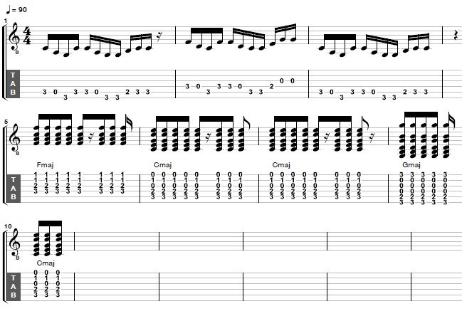 Now is the time to dig into the chords that are happening behind the melody we just went over. So once the full band comes in, you have this chord progression going on. Remember we’re going to use an F Major bar chord in this song. But don’t worry it’s not too bad if you want to substitute an open F Major chord for the bar chord.